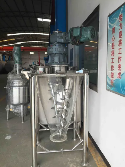 Double screw mixer is convection mixer of high efficiency.It has characteristic of gentle, high accuracy mixing and no damage to product.Two screws suspended from a turning arm, with different rotation semi diameter and different length, make three-dimensional action;Meantime, two screws make self rotation.