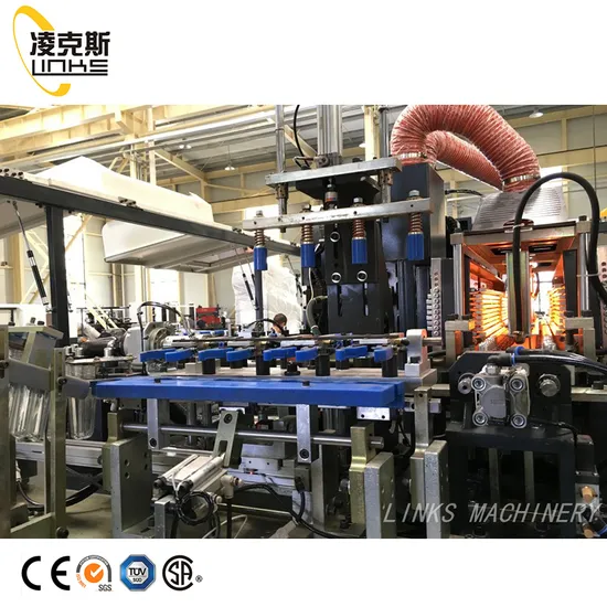 1). This PET Bottle Blowing Machine adopts the new type double bend arm and four pull rod-clamping structure (won the patent). Cross direction; middle mould board is move parallel; the distance between two mold bases is adjusted by the chain wheel. Thus, the clamping force is very strong.