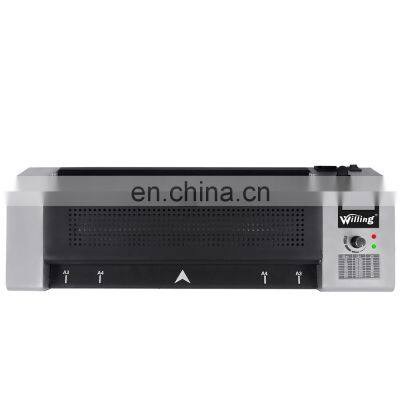 Product DescriptionHigh Quality Caide Office Equipment Table Sheet 4 Rollers Hot Cold A3 330mm Plastic Film Laminator Machine Product NameBusiness Laminator Model NOOL355BrandWillingEntry width330mmApplicationsMax A3 sizePower1000WLamination speed300mm/minOverheating protectionThermal FuseWarm up time<3minMax Lamination Thickness0.8mmLamination Width230mmTemperature control systemNTC +MCUTemperature control75mic:108-113℃; 80mic:113-116℃100mic:117-123℃; 125mic:124-132℃150mic:133-139℃; 175mic:140-147℃200mic:148-157℃; 250mic:158-170℃CertificationCE EMC CBProduct size472*178*110mmWarranty1 YearCarton Size392*315*140 mmPlace of ProductGuangdong,CN Feature1.Metal cover processional heavy-duty laminator.2.LCD Temperature control.3.Overheating protection ON/OFF.4.Suitable for full range of pounches thickness 75-250mic. Related ProductsCompany InformationLong-term PartnerCompany PicturesCertificatesExhibition PicturesPackaging & ShippingFAQ