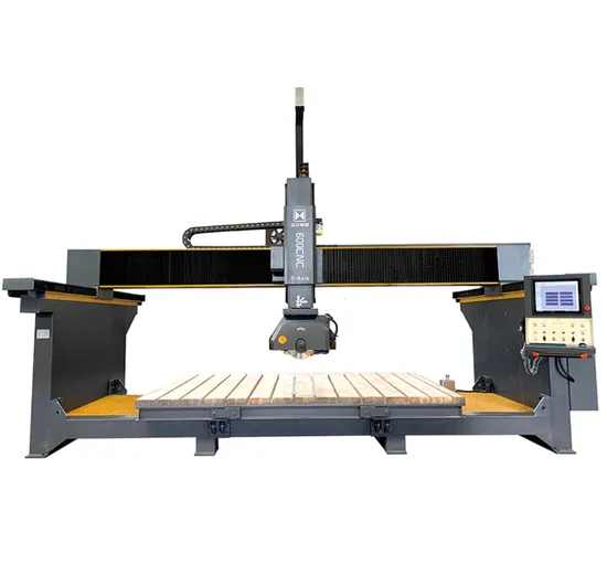 We supply 5-axis CNC Bridge Saws, type ZLBS-600CNC/5A 5-axis smart cutting machine for processing quartz, marble, and granite. It's high-efficiency, high-precision, easy, and simple to operate. Take a photo, put the drawing on the stone in the photo, and then start the machine, which will process itself. The main part of the type ZLBS-600CNC/5A can be put into an open-top high-cube container.