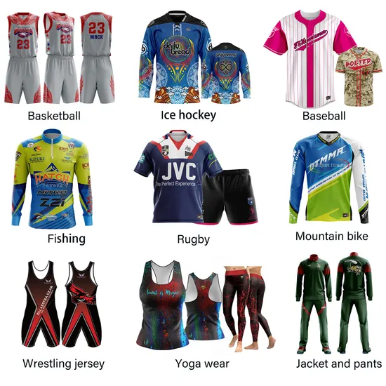 We can make Basketball uniforms, Ice hockey uniforms, Baseball jereys and pants, American football jerseys and pants, Fishing shirts, Mountain bike jerseys, Rugby jerseys,