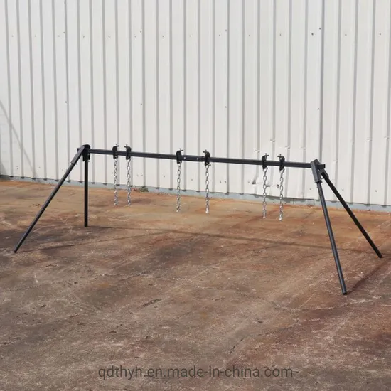 The TianHua Outdoors Gong Shooting Stands are perfect for everyone from beginner to expert shooters! Each of these stands are made from high quality steel and powder coated for years of use and abuse. Features: - Designed for easy set-up and take down. - Brackets and chains included to hold target. - High quality steel frame with thick powder coat for years of use and abuse. - Use stand for any style of hanging targets or for an archery bag. Specifications: - Height: 27.5" - Leg Length: 35" - Top Bar Width: 37.5" - Overall Width: 5' - Weight: 22 LB