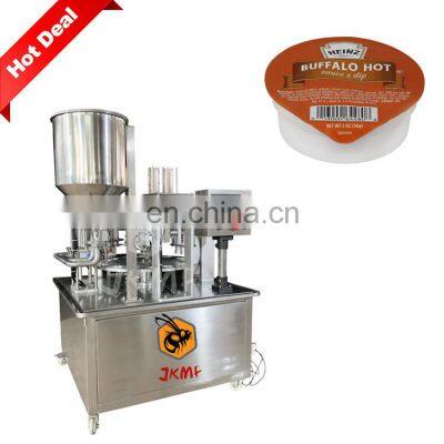 High Speed Automatic Hot Sauce Dip Cup Filling and Sealing MachineProducts DescriptionApplicationThe rotary cup machine is fully automatic to container-loading, fill, foil-loading, seal and overlid stackable containers with reliability and accuracy. This cup filling sealing machine is equipped with PLC and touchscreen HMI, gives flexiblity to configure properly for your application. All control functions are adjustable via the menu-driven operator interface. Precision made and built to last, our cup filling and sealing machine combines innvoative features, customized for a perfect fit every time.The mold of this machine can be customized according to product requirements.The machine can be customized for filling sealing packing ice cream, yogurt, milk, soymilk, chilli sauce,juice, honey, ketchup, mineral water etc.Machine InformationHoney spoon filling machineModelJK-250HSJK-320HSPacking speed800~1000 pieces/hour1600~2000 Pieces/hourFilling volume1~20gMachine power220V/380V,50HZ,4KW220V, 50HZMachine size(L*W*H)1217*1015*13431250*1250*1650Machine weight250KG280KGMain Features1. Digital screen display with numerical setting and flexible operation.2. Imported PLC control system and color touching screen, easy operation.3. Imported film driving system and color sensor enable accurate position.4. PID independent control of temperature, more suitable for different packaging material.5. Multiple automatic alarming functions, maximum deduction the loss.6. Dual encoders enable more stable performance.Machine Working ProcessTouch Control ScreenSet the parameters on the screen, such as filling weight, speed, etc.Falling Cup DeviceSpoon drop down one by one automatically.Metering Filling DeviceAutomatically measure the required weight and fill it into the cup.Foil Film Lid StationVacuum arm suck and put foils on cups for cup sealing.Heating sealing deviceAutomatic high temperature sealing, good sealing performance.Automatic Delivery of Finished ProductsGet perfect finished cup.Why Choose UsJIKE BEE MACHINERY has a professional team to provide customers with various packaging solutions. Fully understanding the needs of customers,engineers design the most suitable solution. We have our own processing and assembly workshop and quality inspection and debugging process to ensure the quality of the machine. After acceptance by the customer, they are packed in international standard wooden cases and shipped.Company ProfileFoshan Jike Bee Automation Equipment Co., Ltd. is a manufacturer of automatic packaging equipment.We are a production-oriented enterprises focused on product innovation, factory direct sales and perfect after-sales service in one.The automatic packaging equipment for granule, powder, liquid and sauce produced by the Jason company is at the advanced level of the industry,it can be customized production automatic material packaging line for all kinds of products .Mainly applicable to: food, hardware, drugs, daily chemicals, pesticides, fruits and vegetables, cosmetics, other industries.The company has its own patent and product technical certification, which can bring customers high quality equipment and worthy of customer trust.Customer PhotosOur customers have covered more than 80 countries around the world.And give us unanimous praise.CertificationsFAQQ1:Do you have manual or operation video for us to know more about the machine? Yes, not only manual or operation video, 3D drawing also available to make as per your design,also the video we can make of testing the material from our packaging machine if your packing goods easier for us to find from our local market. Q2:How can I trust you for the first time business ?Please note our above business license and certificate. And if you don't trust us, then we can use Alibaba trade assurance service, guarantee your money, and guarantee your machine's on-time delivery and machine quality.Q3:Is engineer available to serve oversea?Yes, but the travel fee is paid by you. So actually to save your cost, we will send you a video of full details machine installation and assist you till the end.Q4:How can we make sure about the machine quality after we put the order?Before delivery, we will send you the pictures and videos for you to check the quality, and also you can arrange for quality checking by yourself or by your contacts in China.Q5:Will you provides the door to door service?Yes. Please offer us your final destination, we will check with our agent to see if it available, and most of the area is ok for us to clearing and sending in your countries.