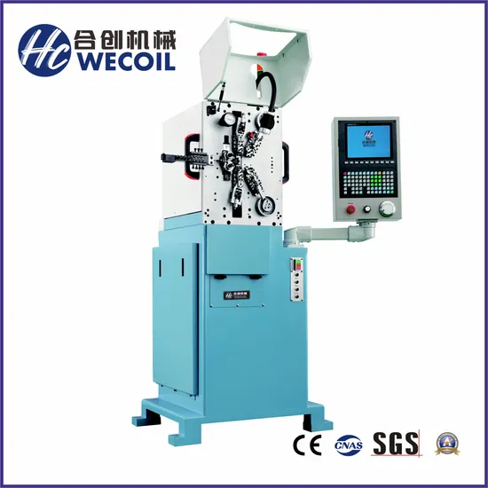 Function point Eight axis control 1. Core seat moving shaft 2.variable diameter 3.wire feed 4.up-cut 5.down-cut 6.up variable diameter 7.down variable diameter 8.Pitch axis Eight axes can be synchronized or single step operation. Computer interface displayed in Chinese and English which makes the operation easy. Configuration of left and right hand winding blade holder. The cutter can be realized on the straight knife and bevelment. torsion cut and pendulum cut. HCT-808 8-axis CNC High-speed Spring Coiling Machine is composed by 8 Japan Yaskawa motor and TaiWan control system, each axis can work independently and synchronously. Our design team made a lot of improvement and innovation with more function and higher automation degree. This up-dated machine can form the spring within one minute, which owns the features of easy to operate, high precision and low noise. It can save much testing spring time and the cost of the raw material. This machine also has the function of straight cutting, subtend cutting and Rotary cutting.