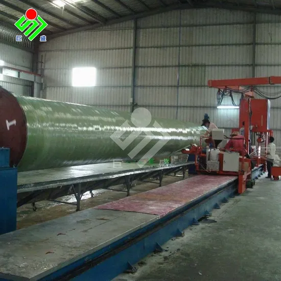 During the working process, the pipe core mold used for pipe making starts to rotate driven by the driving head of the FRP pipe winding equipment. Next, the winding trolley installed on the winding track will start to make a reciprocating motion linked with the main shaft along the axial direction of the pipe core mold according to a certain mathematical model. The glass fiber pre-impregnated with resin through the dipping tank is wound onto the pipe core mold. Then, the sand clamping device clamps quartz sand onto the pipe core mold through the emery cloth according to a certain thickness and a certain glue content. The pneumatic pressure roller drives out the bubbles in the sand-interlayer and compacts the sand-interlayer, thereby completing the winding and sand-interlayer work of the structural layer.