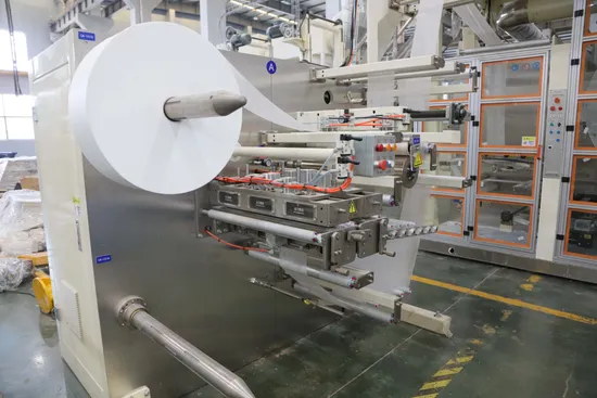 Auto lubricating System Auto lubricating for the cutter units ,can make the machine have better cutting effect and extend the life of cutter system | Human-Machine Interface Working speed(piece/min), single producing output, monthly output,annual output, counting quantity and products' passing rate can show on the screen | Materials automatic feeding System Main raw materials adopt auto unwinding, auto splicing, tension control, auto FIFE web guider functions to guarantee the precise and stablility |