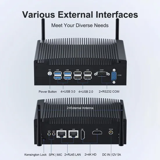 Effortless Integration for Office, Entertainment, and Industrial Needs17-Port Versatile Integration HubThis mini computer is a compact powerhouse with 17 versatile ports,effortlessly connecting devices for office, entertainment, or educational use. Featuring 4 USB 3.0, 4 USB 2.0, 2 HDMI, 2 Gigabit Ethernet Ports, 2 RS232 COM Ports, 1 3.5mm SPK/MIC Port, 1 5.5mm DC connector, and 1 Power port, it caters to diverse connectivity needs. Ideal for personal, industrial, or commercial applications, it comes with power LED, a power button, and a reset button. Plus, our complimentary VESA bracket ensures convenient wall or monitor mounting.