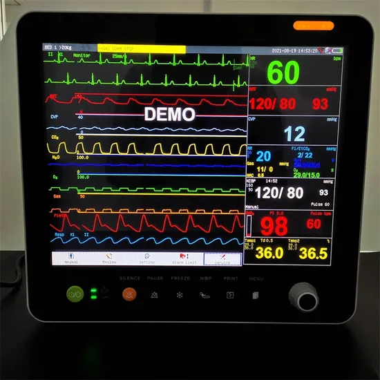 Features:* 6 Standard parameters: ECG, RESP, NIBP, SPO2, 2-TEMP, PR/HR.* 8 "high resolution color TFT LCD display.* Real time S-T segment analysis, pace-maker detection.* Indication of Incorrect manipulation and malfunction analysis.* Patient info input management function* Multi-lead ECG waveforms display in phase.* Large volume of tabular and graphic trends information storage and easy to recall* Capture dynamic waveforms.* Efficient resistance to interference of defibrillator and HF knife.* UP to 2 hours working capacity of built-in rechargeable battery.* Unique accessory management cabinet.* Networking capacity.* Option: IBP, ETCO2 and 2-IBP.Standard Parameters:ECG, RESP, NIBP, SpO2, PR, TEMP1. 12.1 color TFT display