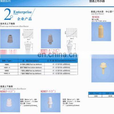 We are professional manufacturer of water treatment accessories. We produce various types of water distribution parts, water caps and flange socket,which can be used together with both automatic control valves such as fleck ,autotrol and manual valves.Distributors typesSuit for tanks N08016"-12"(∅150-∅300mm)N0801-A6"-12"(∅150-∅300mm)N08026"-12"(∅150-∅300mm)N0802-A6"-12"(∅150-∅300mm)N2807-16"-16"(∅150-∅400mm)N2807-16"-16"(∅150-∅400mm)N2810N28116"-12"(∅150-∅300mm)N2812N28138"-16"(∅200-∅400mm)ES6260A112"-16"(300-400mm)ES6370A118"-21"(450-550mm)ES6450A124"(600mm)ES6600A130"(750mm)ES6700A136"-42"(900-1000mm)ES6800A148"-63"(1200-1600mm)ES6260B1ES6260B212"-16"(300-400mm)ES6370B1ES6370B218"-21"(450-550mm)ES6450B1ES6450B224"(600mm)ES6600B1ES6600B230"(750mm)ES6700B1ES6700B236"(900mm)ES6850B1ES6850B240"-48"(1000-1200mm)HU6700B1-2HU6700B2-236"-42"(900-1000mm)HU6850B1-2HU6850B2-248"-63"(1200-1600mm)EF6260B1EF6260B212"-16"(300-400mm)EF6370B1EF6370B218"-21"(450-550mm)EF6450B1EF6450B224"(600mm)EF6600B1EF6600B230"(750mm)EF6700B1EF6700B236"(900mm)EF6850B1EF6850B240"-48"(1000-1200mm)HD6700B1-2HD6700B2-236"-40"(900-1000mm)HD6850B1-2HD6850B2-248"-63"(1200-1600mm)Distributors typesSuit for tanksES5669B1-1ES5669B2-124"(600mm)ES5670B1-1ES5670B2-130"(750mm)ES5672B1-1ES5672B2-136"(900mm)ES5673B1-1ES5673B2-142"(1000mm)ES5674B1-1ES5674B2-148"(1200mm)ES5675B1-1ES5675B2-160"(1500mm)ES5676B1-1ES5676B2-163"-80"(1600-2000mm)ES5669B1-2ES5669B2-224"(600mm)ES5670B1-2ES5670B2-230"(750mm)ES5672B1-2ES5672B2-236"(900mm)ES5673B1-2ES5673B2-242"(1000mm)ES5674B1-2ES5674B2-248"(1200mm)ES5675B1-2ES5675B2-260"(1500mm)ES5676B1-2ES5676B2-263"-80"(1600-2000mm)EF5669B1-1EF5669B2-124"(600mm)EF5670B1-1EF5670B2-130"(750mm)EF5672B1-1EF5672B2-136"(900mm)EF5673B1-1EF5673B2-142"(1000mm)EF5674B1-1EF5674B2-148"(1200mm)EF5675B1-1EF5675B2-160"(1500mm)EF5676B1-1EF5676B2-163"-80"(1600-2000mm)EF5669B1-2EF5669B2-224"(600mm)EF5670B1-2EF5670B2-230"(750mm)EF5672B1-2EF5672B2-236"(900mm)EF5673B1-2EF5673B2-242"(1000mm)EF5674B1-2EF5674B2-248"(1200mm)EF5675B1-2EF5675B2-260"(1500mm)EF5676B1-2EF5676B2-263"-80"(1600-2000mm)E5671E5671B12"-36"(300-900mm)E5671ALE5671BL36"-48"(900-1200mm)H17624"-48"(600-1200mm)H176L-148"-63"(1200-1600mm)type N99034"-2.5"adaptorN99056"-4"FLG adaptorN9914-A4"closureN9136"GLG closureN182A N182B N182-1 UM1 UM2 N99103"BSPP/3"NPA89/90N99113"BSPP/3"NPA4"UN/4"NPAN99123"BSPP/3"NPA3"BSPP/3"NPAN99012.5"-8NPSMG1"/NPT1"N99024"-8UNG2"/NPT2"