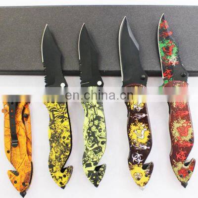 8.5 Inch Series Glass Breaker Stainless Steel Camping knife With Emergency Rescue Knife specification: * Different handle colors are available, such as: Blue, Red, Black, Green,Orange, etc.* You can also choose 440 or other stainless steel to make the knife blade* The knife blade can be black coated, titanium coated, bead blast finish or satin finish.* We can use other materials to make the knife handle as you request, such as G10,Micarta, Aluminum, Stainless steel, Wood, Plastic, Animal Horn or Animal Bone, etc. Quality description: Locking MechanismLinerlock folding knifeHandle length130mmHandle materialCamo coated stainless steelBlade length85mBlade finishSilver coatedBlade material420 or 440 stainess steelweight145.4GComes withPocket clipRemarksDifferent handle color is available Photo Show: Company Introduce: Yangjiang Homeful Industry & Trade Co., Ltd. was founded in 1998. Our company is manufacturer and sale of all kinds of outdoor knife, camping knife, hunting knife,pocket knife,knife set ,dive knife,survial knife,combat knife,sporting knife,rescue knife,canoe knife,toothpick knife,hunting knife,outdoor knife, fixed blade knife, swiss knife ,utility knife,multi tool,multi tool pliers ,axe,multi hammer ect.Our strengths: competitive price + stable quality + flexible service + quick supply ability+ OEM available Payment team: 1.MOQ: 1000PCS 2.Lead time: about 35 days after order confirmed. Payment terms: 30% deposit, remain 70% against fax copy of Bill of Lading and other shipping documents. 3.Sample time: 3 days without logo, 5 days with logo. warning the knives in this tool are extremely sharp,and should be used with the utmost care and caution Contact us: *If you have any question about our products or your shipping status of your order,please feel free to contact us. *We will answer your message within 24 hours. Website: Add.:Yuyuan 5 Road,Yitong Industrail Zone,Yagnjiang ,Guangdong,China. Welcome to visit our company!!