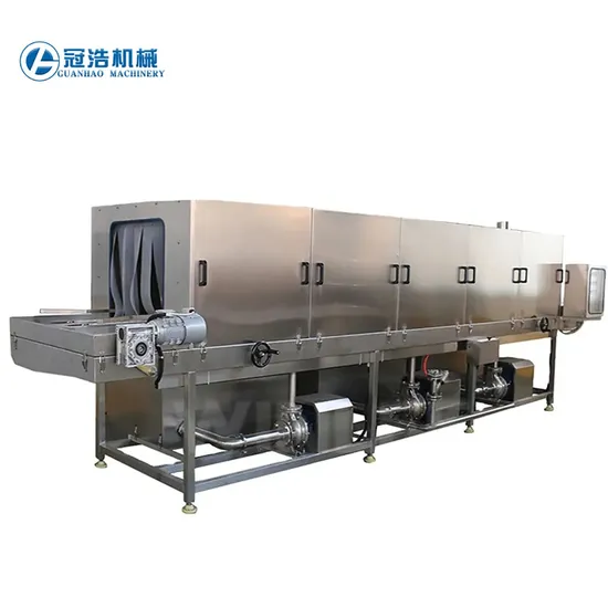 The target enter into the machine from the stainless steel chain, sequentially through the warm water to high pressure hot water to room temperature water to disinfection water and then remove the water from the powerful fan. Sterilization and blow dry at the same time when the target is cleaned up fully. For hard cleaning, the hot soda water can be added and plus several brushes, focus on the bottom and two sides of the target, using continuous cleaning mode to improve the clean up effect.