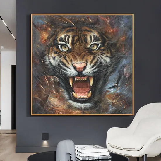 Tigers This is a painting depicting a tiger. Tigers are one of the largest cat - species in the world and are often regarded as symbols of strength, majesty, and courage. In this painting, the tiger opens its mouth wide, revealing sharp teeth, with a keen gaze. The dark and dynamic background tones highlight the ferocity and domineering presence of the tiger, creating a strong visual impact. It may be intended to showcase the powerful aura of the tiger as the king of beasts. Detailed Photos