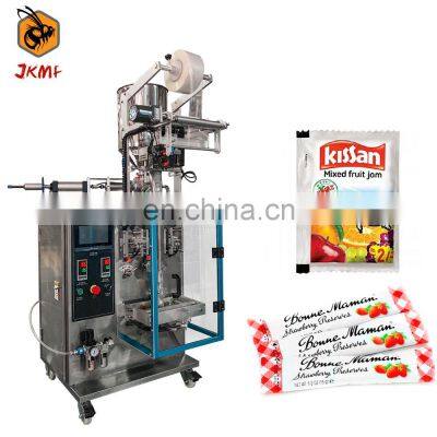 Fruit Jam / Honey / Paste / Ketchup / Mayonnaise Chocolate Liquid Packing Machine Filling and Sealing MachineProducts DescriptionThis Machine designed for the automatic package of liquid, semi-liquid ,stickly liquid materials. Such as water, honey, cream, shampoo, cosmetic cream, paste, sauce, oil, bean sauce,chocolate sauce, ketchup, perfume etc.According to customer needs, it can be customized to meet the needs of a variety of bag packaging. Such as back seal bags, 3/4 side seal bags, round corner bags, straight cut bags, special cut bags, etc.Machine InformationMain Features1. The section where the material contact is stainless steel as the body of machine is optional for complete or partial stainless steel and all out equipments have passed the CE Standard.2. Optional English or other languages screen display, easy and simple operation. 3. High-sensitivity photoelectric color tracing and digital input of cutting position get more accuracy.4. Packaging speed and length of bags can be set to some extent without further adjustment and parts changing packaging speed and length of bags can be set to some extent without further adjustment and parts changing. 5. Bag-making, filling, sealing, cutting, counting can be achieved automatically and straightly. 6. Bag-making equipment can be changed according to specific requirement of customers and products.Filling Range1~100mlMeasuring TypeLiquid metering pumpPacking Speed30~80 bags/minBag Width15~100mmBag Length30~180mmSealing TypeBack sealing / 3 sides sealing / 4 sides sealingMachine Weight400 KGMachine Power220V,50HZ,1.2KVAOptional DevicesDepending on your needs, you can choose to add the following configuration. For example date printer, linking bag device, gas-filled device, easy tearing device and hole device.4 Step Easy To OperateThis machine is easy to operate and can be used in only 4 steps.Step 1. Set the parameters and temperature.Step 2. Put the packaging film on the film holder.Step 3. Pour the product into the hopper.Step 4. Start the machine, and the machine will run automatically.We will package the machine's instruction manual and a USB flash drive with machine operation videos together with the machine. Ensure that you can use the machine as soon as you receive it. If you have something you don't understand, our after-sales team will also help you answer in time.Why Choose UsDession has a professional team to provide customers with various packaging solutions. Fully understanding the needs of customers,engineers design the most suitable solution. We have our own processing and assembly workshop and quality inspection and debugging process to ensure the quality of the machine. After acceptance by the customer, they are packed in international standard wooden cases and shipped.CertificationsCustomer PhotosOur customers have covered more than 80 countries around the world.Company ProfileFoshan Jike Bee Automation Equipment Co., Ltd. is a manufacturer of automatic packaging equipment.We are a production-oriented enterprises focused on product innovation, factory direct sales and perfect after-sales service in one.The automatic packaging equipment for granule, powder, liquid and sauce produced by the Jason company is at the advanced level of the industry,it can be customized production automatic material packaging line for all kinds of products .Mainly applicable to: food, hardware, drugs, daily chemicals, pesticides, fruits and vegetables, cosmetics, other industries.The company has its own patent and product technical certification, which can bring customers high quality equipment and worthy of customer trust.FAQQ1:Do you have manual or operation video for us to know more about the machine? Yes, not only manual or operation video, 3D drawing also available to make as per your design,also the video we can make of testing the material from our packaging machine if your packing goods easier for us to find from our local market. Q2:How can I trust you for the first time business ?Please note our above business license and certificate. And if you don't trust us, then we can use Alibaba trade assurance service, guarantee your money, and guarantee your machine's on-time delivery and machine quality.Q3:Is engineer available to serve oversea?Yes, but the travel fee is paid by you. So actually to save your cost, we will send you a video of full details machine installation and assist you till the end.Q4:How can we make sure about the machine quality after we put the order?Before delivery, we will send you the pictures and videos for you to check the quality, and also you can arrange for quality checking by yourself or by your contacts in China.Q5:Will you provides the door to door service?Yes. Please offer us your final destination, we will check with our agent to see if it available, and most of the area is ok for us to clearing and sending in your countries.