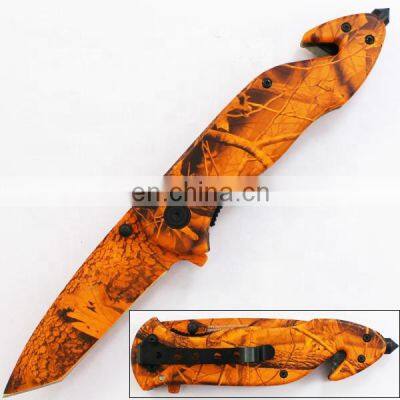 8.5 Inch Series Glass Breaker Stainless Steel Rescue Outdoor Folding Knife specification: * Different handle colors are available, such as: Blue, Red, Black, Green,Orange, etc.* You can also choose 440 or other stainless steel to make the knife blade* The knife blade can be black coated, titanium coated, bead blast finish or satin finish.* We can use other materials to make the knife handle as you request, such as G10,Micarta, Aluminum, Stainless steel, Wood, Plastic, Animal Horn or Animal Bone, etc. Quality description: Locking MechanismLinerlock folding knifeHandle length130mmHandle materialCamo coated stainless steelBlade length85mBlade finishSilver coatedBlade material420 or 440 stainess steelweight145.4GComes withPocket clipRemarksDifferent handle color is available Photo Show: Company Introduce: Yangjiang Homeful Industry & Trade Co., Ltd. was founded in 1998. Our company is manufacturer and sale of all kinds of outdoor knife, camping knife, hunting knife,pocket knife,knife set ,dive knife,survial knife,combat knife,sporting knife,rescue knife,canoe knife,toothpick knife,hunting knife,outdoor knife, fixed blade knife, swiss knife ,utility knife,multi tool,multi tool pliers ,axe,multi hammer ect.Our strengths: competitive price + stable quality + flexible service + quick supply ability+ OEM available Payment team: 1.MOQ: 1000PCS 2.Lead time: about 35 days after order confirmed. Payment terms: 30% deposit, remain 70% against fax copy of Bill of Lading and other shipping documents. 3.Sample time: 3 days without logo, 5 days with logo. warning the knives in this tool are extremely sharp,and should be used with the utmost care and caution Contact us: *If you have any question about our products or your shipping status of your order,please feel free to contact us. *We will answer your message within 24 hours. Website: Add.:Yuyuan 5 Road,Yitong Industrail Zone,Yagnjiang ,Guangdong,China. Welcome to visit our company!!
