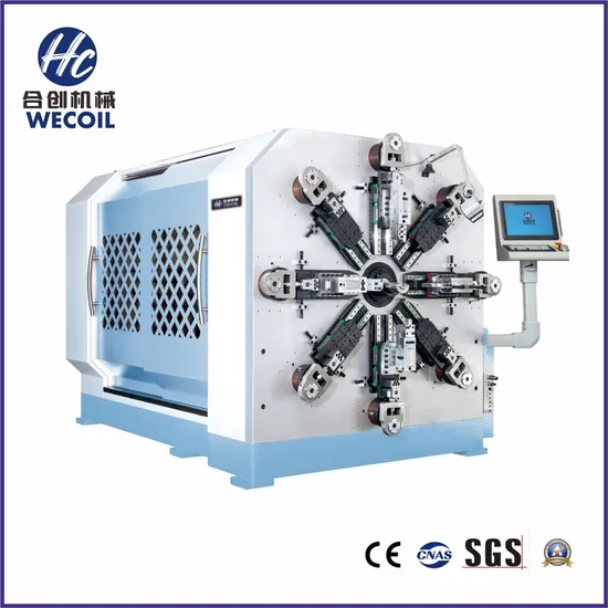 HCT-0520WZ 5 Axis CNC Versatile Spring Rotating Forming Machine adopts TaiWan CNC control system and Japan Yaskawa Servo Motors to control the feeding system and Cam system synchronously. It has total 5 axes, the Cam axis, Feeding axis, Quill Rotary axis, the Wire rotary axis and the Spinner axis. This machine is suitable for making various Compression spring, Extension spring, Single (double) torsion spring, Tower shaped compression spring, Flat wire spring, and any kind wire forming.