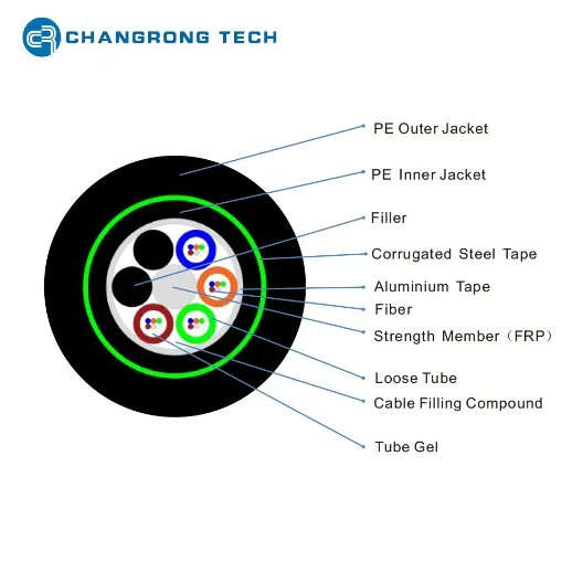 The fibers are positioned in a loose tube made of high modulus plastic and filled with gel. Tubes (and fillers) are stranded around the non-metallic strength member to form the cable core. An Aluminum tape(APL) is applied around the cable core, which is filled with the water-blocking compound. Then the cable core is covered with a PE inner jacket. After the corrugated steel tape(CST) is longitudinally armored over the inner jacket, the cable is completed with a PE outer jacket.