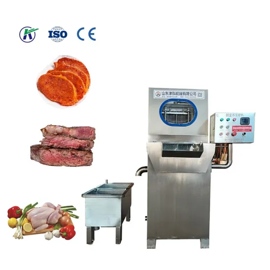 The automatic brine injection machine is to inject water, starch and other curing liquid into the meat to fully marinate, which can tenderize and soften the meat, improve the taste and yield of meat products, shorten the curing time, and improve production efficiency.Saline injection machine is equipped with automatic protection device, when the injection needle touches the bone and other hard objects can be lifted, not damaged, according to different process requirements, adjust the stepping speed, stepping distance, pressure meat plate gap and injection pressure, the curing liquid evenly and continuously injected into the meat, to achieve the ideal injection effect Detailed Photos