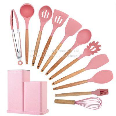 | Food Grade Material: Our silicone utensils cooking set is made of premium food-grade safe material which is durable,sturdy,non-stick,so you don’t have to worry about the health problem of your families.And it will not be rust,breaking,bending,melting. It will last longer than the other plastic kitchen utensils. Wonderful Design: The wooden handle combines with silicone perfectly,beautiful color bring you visual enjoyment and good mood. Accept Your Special Demands, Let You Save Time and Worries. What You Get: Brush, Pasta server, Spatula, Slotted turner, Solid turner, Soup ladle, Slotted spoon, Solid spoon, Flat spoon, Whisk, Tongs, Storage bucket, Color box.Do What You Want, Think What You Care.