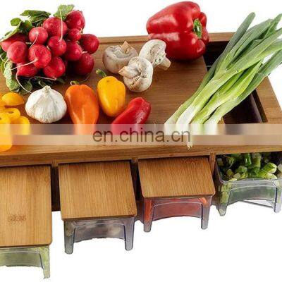 Eco Friendly Multi-purpose For Kitchen Bamboo Cutting Board With 4 ContainerSpecificationItem number:AC138Size:47x33x8.5cmBox size:48.5x34x10.5cmCarton size:5pcs/CTN 50x35.5x54cmProduct DescriptionPacking & DeliveryTo better ensure the safety of your goods, professional, environmentally friendly, convenient and efficient packaging services will be provided.Standard package:Heat seal bamboo product +foam protective+brown corrugated boxCompany ProfileFounded in 2014,we are a professional manufacturer of premium bamboo products, including kitchenware, bathroom accessories, storage and organization in series. Our most popular items are drawer organizers, cutting board, cheese board and bath caddy.We provide hundred products for you and enrich your home decoration and kitchen life.We enjoy to take time with you to discuss how to make better products for your market.FAQ1.Are you factory?Where is your factory location?Yes,we are manufacture. Factory is located in Zhenghe,Nanping,Fujian.2.What is your main product?Our main products are kitchenware,chopping board(cheese board and cutting board),bath caddy and drawer organizers.3.Can you do customized products?Yes,we can and always do customized design.4.Does the product you supply have quality guarantee period?Yes,of course.Warranty is 1 year.5.How about your production capacity per day and per month?And what's the MOQ?Per day production capacity is 1000pcs.Per month production capacity is 30,000pcs.MOQ is 500pcs. We also can sell products stocks in small quantity.6.What is the lead time?About 45 days.It depends on the amount and the product.7.What's your payment term?T/T,30% deposit before production,70% balance against shipment or copy B/L.LC and Alibaba trade assurance at sight are also acceptable.8.Can you offer sample for us?How long can we get it?We can offer samples within one week with freight collect.But the samples cost should be on your account and will refund after order