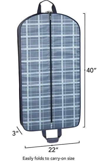 Hangers at the top of the bag to keep clothes neat and wrinkle-free. Holds up to 6 hangers of any kind for quick and easy packing. Two large pockets with room for shoes and accessories. Handles fasten together and attach to the trolley system of rolling luggage. Custom fashion houndstooth plaid lined interior for added protection. Conveniently fits in the overhead bin for most airlines. Full-length center zipper. Carefully selected, durable polyester fabric is water repellent, providing all-weather protection. Dimensions: 40" x 22" x 3" Fabric Type: Polyester Item Weight: 2.0 lbs |