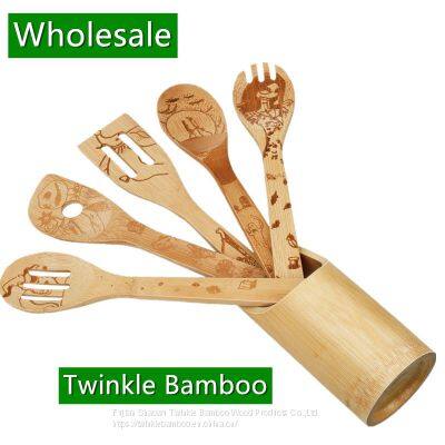 Bamboo wood kitchen utensil burn bamboo utensils spoon set engraved from China