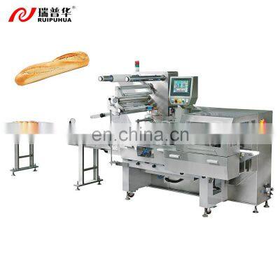 Baguetee bread croissan donut bakery food automatic flow pillow packaging packing machine Applications: Suitable for packing bakery food products, frozen-foods, and products with plastic tray/box etc. Product Description ModelRD-BM-508SRD-BM-708SPacking speed 35-120Bags/min 60-120Bags/min Bag size L100-500, W50-200, H5-100MML180-500, W50-300, H5-120MMFilm WidthMax.500mmMax. 670mmPacking materialsKNY+PE, KNY+CPP, OPP+CPP,PET+CPP,PET+VMCPPDimension L:4000 X W:1139 X H:1680MML:4300 X W:1250 X H:1700MMTotal power 3.5kwTotal weight 1400kgs Main Features1. 5 Servo control: equipped with 5 servo motors to precisely control the movements of each part. Responsive and easy to use.2. Reciprocating cutter make sure 100% cut-off , the cutter is not easy to wear, and more convenient to install and clean than the rotary knife.3. Diverse packaging: suitable for a variety of packaging style, a set of equipment can be capable of packaging products of different sizes.4.10.4-inch touch panel, humanized operation interface, packaging setting parameter input, error (abnormal) warning, packaging statistics can all be displayed on the man-machine interface.5.100 Recipes: Able to save up-to 100 sets of packaging products input, storage, modification, management.6.Miscut protection: prevent miscuts from happening and avoid product waste caused by miscuts.7.No material standby: prevent the occurrence of empty packages and save the cost of packaging materials.8.Troubleshooting: Clearly mark the location of the alarm, which can be quickly eliminated to save time and consumption.9.Stable and noise-free: precise design and precise production make the machine no noise during operation.10.Durable structure: The components are precisely designed to prevent wear and are not easily damaged after long-term use.11.Ensure sanitation: Any parts that have direct contact with the packaged items are made of SUS304 food grade stainless steel. Full automatic feeding& packing line is also available if you have more demands--- We are profeesional in automatic feeding & packing solutions , please see below cases--- Foshan Ruipuhua Machinery Equipment Co., Ltd. was established in 2005 and is located in Foshan, Guangdong Province. It is a professional intelligent assembly line equipment manufacturer integrating design,manufacturing, installation and technical services. The leading products include food packaging machines, packing lines,and high-speed mask production lines. Our products are mainly used in food, medicine, daily chemical, hardware, toys and other industries. It is an equipment supplier to many well-known food companies at home and abroad, such as Taoli, Panpan, Ma Dajie, Xu Fuji, Orion, Jin Longyu, Tongyi, etc. Our products cover 34 provinces and municipalities across the country and are exported to more than 100 countries, and have provided automatic feeding and packaging solutions for more than 4,000 customers. pacWhy choose us?1. Manuals / Videos of machine installation, adjusting, setting, maintenance are available for you. 2. If any problems happened and you can not find out the solutions, online face to face communication available 24 hours.3. Ruipuhua engineers & technician are available send to your countries for services if you agree pay the expenditure.4. One year guaranty for machine. During the warranty if any of the parts broken not by man-made. We will free charge to replace the new one to you.5. Ruipuhua has an independent team for after-sale service. Any emergency please call the salesman or our after-sale's manager. Company Honor-National high-tech enterprise;---2016-National invisible champion of Nanhai manufacturing;----2017-Reported by CCTV (China Central Television) Financial Channel;----2018-Won the honoraty tiles of "Leader in the industry", "Single Champion","Transitional Special New", "Brand Enterprise", "Technological Enterprise", "Government Quality Award", "Foshan Engineering Technology Research Center"... ...----2018-Guangdong province market quality credit A-level customer satisfactgion enterprise. ----2019 ... ...