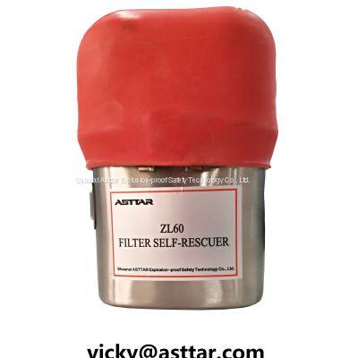 Product Description Underground mining filtered self-rescuer ZL60 ZL60 is a protective device for personal breathing system, the toxic carbon monoxide(CO) in air oxidizes into nontoxic carbon dioxide(CO2) through chemical reaction under normal temperature. It applies to the environment where the concentration of oxygen(O2) is not less than 18% and carbon monoxide(CO) not more than 1.5%, for the use of rescue teams in the event of an underground emergency. Specification