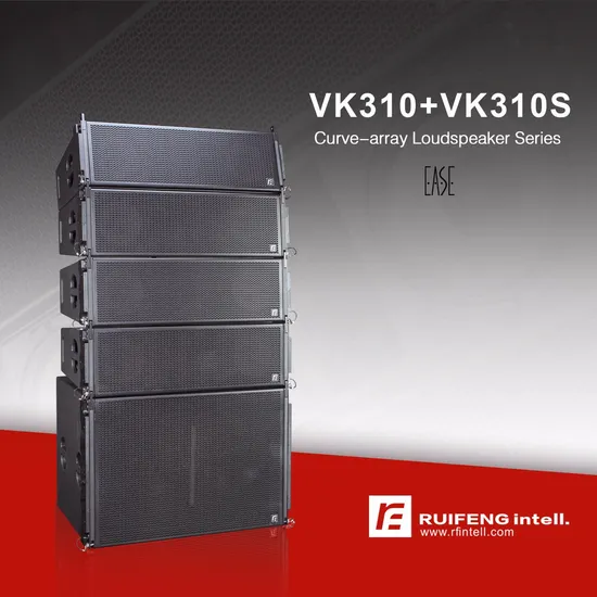1.VK310 is a dual 10" three-way tri-amp compact line array speaker, adopts premium high-efficiency light weight neodymium speaker unit;The low frequency unit use 2 symmetrically placed 10" rubber edge unit,to ensure the low frequency has compact sound and strong impact force; Medium and high frequency with coaxial point source structure design, a 8" MF neodymiumunit drivers the MF horn,1x2.55" neodymium tweeter units and a planar wave converter are installed on the same axis,It has horizontal dispersion of 90 degrees and vertical dispersion of 10 degrees,the angle makes the sound form an ideal linear acoustic wavefront, and the