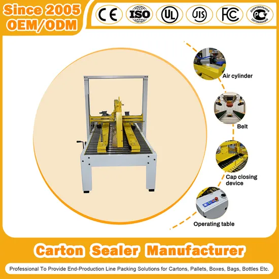 carton sealer machine with both side drive in close all four top case flaps, use the handle to adjust width and height, the structure design of the high strength makes the ma-chine has reliable performance and can be adapted to production line continuous heavy sealing work.