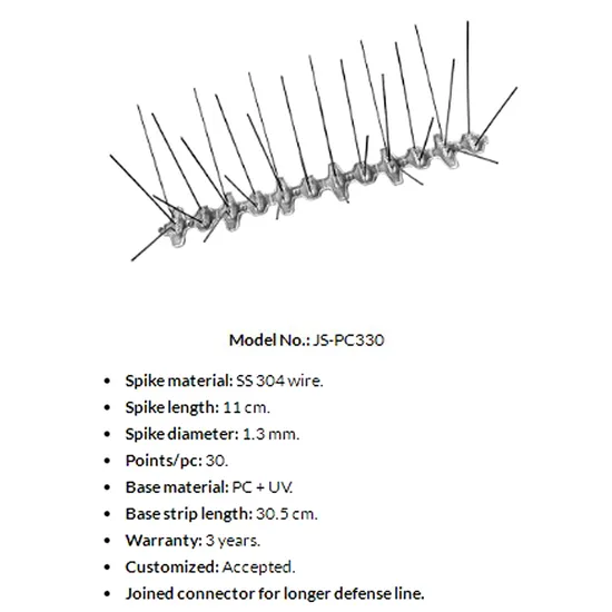 The bird spikes are consists of 304 stainless steel wire and UV resistant polycarbonate base, which is durable for more than 10 years. The bird spikes are widely used in : Ledges, parapets, signs, pipes, chimneys, lights, etc. It is easy to install on the building surface with glue or screw.