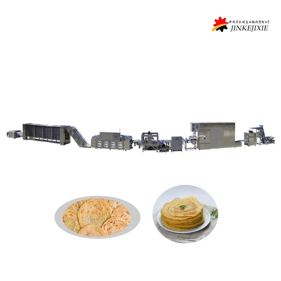 Parotta Production Line integrates raw material preparation, dough making, molding, baking or frying, cutting, and packaging to automate production from raw material to finished product. This production line not only improves production efficiency, but also ensures the stability and consistency of product quality. During production, the dough is taken out of the mixer to ferment, and then directly fed into the dough hopper by the conveyor belt , after pre-pressing , thinning and other actions.Then the dough will be stretched to a thickness of less than 1mm again by the stretching machine, and then smeared with oil and sprinkled with green onion and spices, and then shaped into a stick by the rolling machine, into a ball by the meshing machine, and then into a pancake by the pie-laminating and laminating machine .The main technical performance indexes of this machine are at the advanced level of the same kind of machine in China. Main features:The machine adopts PLC and touch screen memory function, and the whole original machine adopts international famous bran . It can be adjusted infinitely within a certain range and process automation.
