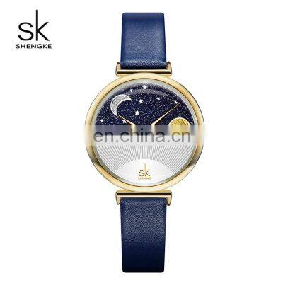 SHENGKE Fashion Starry Sky Lady Wristwatch Sun Moon Dial Watch Leather Band Strap Watches K0124L Model Number K0124LBrand SHENGKE(SK)Style Fashion Women's WatchMovementJapan Quartz (PC20)Case Material AlloyDiameter /Thickness32.0MM/7.0MMBand MaterialPU L.eather BandBand Width12.0MMWaterproof3 ATMBattery Life18 Months 1. What's your MOQ? Can I mix styles and colors?A: Take our brand logo watches for wholesale is no MOQ limited , but if customized your logo (OEM ), the MOQ is :Alloy case watch 300pcs/style,can mix 2~3 colors ,stainless steel case watch 500pcs/per style .can mix 3~5 colors 2. Can we print our own logo?A: Yes,we can print your logo or design on the band, dial, buckle, back, case and other place, usually the color of the logo is one color.3.What about the warranty?A: 12 months movement warranty, and we are very confident with our products, and we will pack it very well, so usually you will receive your goods in good condition. But to avoid any subsequent trouble regarding quality issue, we suggest you check the watches once you receive them, and let us know if there is any damaged ones, so that we can deal with it accordingly.4.Do you offer Drop shipping (Blind shipping )?Yes , we offer Drop shipping/Blind shipping,we haven enough experience in drop shipping ,every day we have many watches to send out many countries for drop shipping.5. Do you do custom watch boxes?Yes, we do custom watch boxes. We can follow your requirement to make the boxes ,or you can select our boxes with your logo.6. What movement do you usually use in your watches?We usually use Japanese movement ,Swiss movement, and Chinese movement, for example Seiko,Citizen,Miyota,Ronda ,Kingstar we use most.7.What is your packaging?1.Not over 5 pcs order ,each watch will be put into a bubble bag then packaging well into a safe white bag(as below picture)2.Over 20 pcs order ,each watch will be put into a opp bag, then put into a bubble bag, after that all total put into a white box.(as below picture)For OEM/ ODM Products packaging:Normal packaging 1.Each piece will be put into a poly bag;2.20 pieces into a white box;3.10 white boxes into a 39*30*33cm carton; Special packaging: As per your request. **Note: Only Normal packaging service is free.