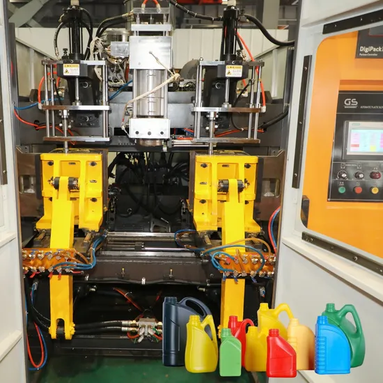 GS-5L-II double station machine is different from the single station machine in that it has one additional station with high-precision linear guide. The same as the single station machines, it can be used to produce a wide variety of materials, such as PE, PP, etc. The largest capacity of the product can be 5L, and its production capacity is 60 to 70% more than the single station machine. In accordance with different type of products, die heads can be changed to achieve multi-type production MACHINE ADVANTAGES