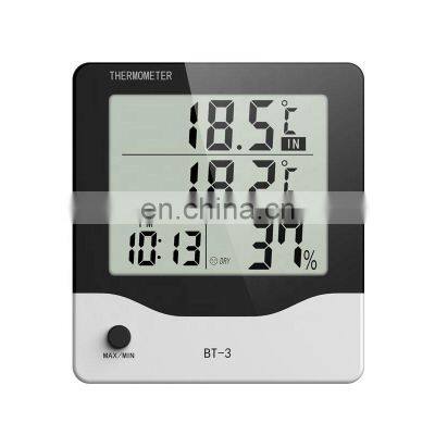 Product DescriptionBT-3 LCD digital thermometer hygrometer digital hygrometer indoorSpecificationsBT-3 Digital Thermometer Temperature ControllerDetails:with big LCD display.Measure and display the indoor/outdoor temperature and indoor humidityAutomatically memorize the Max./Min. values of temperature and humiditySwitch between C/FClock function12/24 hour mode switchRecovery function on the Max./Min. values Indoor temperature measuring range0°C ~ +50°C(32F∼122F)Outdoor temperature measuring range-50°C+70°C(-58F∼158F)Indoor humidity measuring range20%∼99% (Relative humidity)ResolutionTemperature:0.1; Humidity: 1% RHPower supplyone 7# alkaline batteryOperation environmentTemperature:0-50C; Humidity: 5%-85% RH.Packing & DeliveryCertificationsOur CompanySinoCool Refrigeration & Electronics Co.Ltd. is a large modern enterprise specializing in refrigeration accessories, we deal with the spare parts more than 10 years. Now have 1500kinds spare parts for Air conditioner , Refrigerator, Washing machine, Oven, Cold room;. We have relied on high technology for a long time and have invested huge amounts of money in compressors, capacitors, relays and other refrigeration accessories. Stable quality, superior logistics and caring service are our advantages.Exihibition