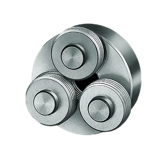Thread rolling dies using the process with two or three Rolling Dies the workpiece is typically placed on a supporting blade. At least one rolling slide has a feed movement to perform the forming process. Simultaneously the dies are rotating synchronously in contact with the workpiece, whereas the profile will be formed out.