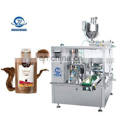 Product ParamentersItem NO.ZC-Y200/250DimensionsL4000mm×W2000mm×H2100mmPacking Speed16-60 Bags/min (depending on products character and filling volume)Packing Bag SizeL: 100-350mmW : 60-200mm/80-250mmWeight1800KGAir Compressed air consemed≤0.6m³ / minAccuracy±1g (≤100g) / ± 1%( >100g) according to materialApplicationSuitable for liquid or semifluid products packing, such as beverages, juice, ketchup, bechamel etc.Working Procedure1.Bag feeding2.Coding3.Opening4.Filling A5.Filling B6.Heat sealing A7.Heat sealing B8.Forming and outputDescription1.According to customer demand for customized, to recommend the appropriate products to customers.2.Storage racks devices which can Satisfy the products short stop ,which can keep the production line work continuously.3.Good service,If you have any questions, you can communicate by telephone video.Recommend ProductsProducts DescriptionCompany ProfileFAQTrade patterns 1. Lead time: 15-20 working days after receive deposit2. MOQ: 1 set.3.30% deposit+ balance payment before delivery by T/T, western union, cash.4. Loading Port: Shantou or Shenzhen Port Export Process 1. We will prepare goods after receive deposit 2. We will send goods to your warehouse or shipping company in China.3. We will give you tracking number or Bill of loading when your goods is on the way 4. Finally your goods will arrive your address or shipping port Frequently Asked Questions Q: First time import, how can I believe that you would send products? A: We are verified company by Alibaba to make transaction success, we support and recommend you to pay money to us by Alibaba Trade Assurance.Q: How about the quality of your product?A: Our products manufactured strictly according to national and international standard-- We have ISO certification-- We take a test on every product before delivery.Q: How to choose the machine type for our bags? A: Pls support us the following information about the bag and the food. 1) Bag pattern (Bag samples or pictures would be appreciated.)2) Bag size 3) The filling weight or volume 4) Material of food: powder/liquid/paste/granular/massiveness Q: What aftersales service or any question about products?A: This machine enjoys 1 year warranty