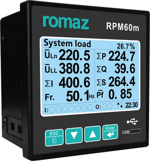 * Measurements:VL-L, VL-N, I, In, Cos , Pf, Hz, W, ∑W, Va, ∑Va, Var, ∑Var, import Kwh, export Kwh import Kvarh,