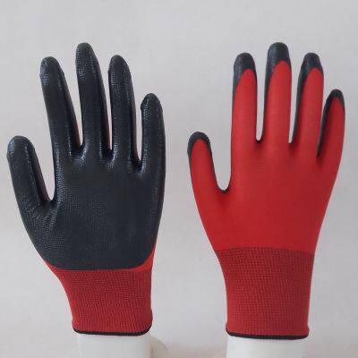 red polyester knitted black nitrile palm coated safety work gloves abrasion-resistance anti-slip breathable