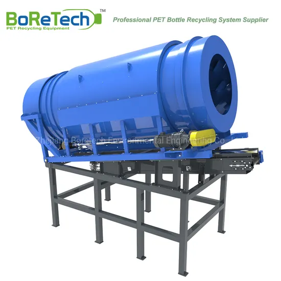 BoReTech supplys two types of sieving machines, dry trommel and disk screener. Disk screener is more compact than the dry trommel, it can be placed after de-baling and pre-washing then remove sand, labels and so on. It can evenly disperse the bottles onto the next process and remove remained water. Dry trommel can remove caps and sands separately by multiple mesh sizes.