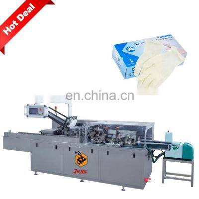 Fully Automatic Gloves Box Packing Machine Medical Surgical Glove Box Packing MachineProducts DescriptionJKMF automatic cartoning machine can achieve full automatic products conveying & feeding, flat carton feeding, carton opening, products pushing, carton folding, carton closing, finished carton package discharging.Machine InformationAutomatic Box Cartoning Machine is a hot sale product developed and manufactured by our company. It is applied to a variety of foods, toys, cosmetics, electronics and daily necessities. Box packing machineJK-Box sizeL:65~350 mmW:30~350 mmH:15~180 mmWrapping speed40~70 box/minGas source0.5~0.8 MpaMachine weight1300KGMachine power220V, 50HZLarge capacity storage box rack With the long boxes' feeding shelf design, you can place up to 2000 pcs boxesSensor Identify the product The box storage shelf will stop to feed boxes once there is no products get detected on the conveyor, which will prevent from the box wasting.Automatic feeding device Pneumatic manipulator can fill materials accurately and at a high speed.Adjustable sealing device With the convenient adjustment design, you can easily to complete the adjustment for the different sizes boxes in 1 min.Why Choose UsJIKE BEE MACHINERY has a professional team to provide customers with various packaging solutions. Fully understanding the needs of customers,engineers design the most suitable solution. We have our own processing and assembly workshop and quality inspection and debugging process to ensure the quality of the machine. After acceptance by the customer, they are packed in international standard wooden cases and shipped.Company ProfileFoshan Jike Bee Automation Equipment Co., Ltd. is a manufacturer of automatic packaging equipment.We are a production-oriented enterprises focused on product innovation, factory direct sales and perfect after-sales service in one.The automatic packaging equipment for granule, powder, liquid and sauce produced by the Jason company is at the advanced level of the industry,it can be customized production automatic material packaging line for all kinds of products .Mainly applicable to: food, hardware, drugs, daily chemicals, pesticides, fruits and vegetables, cosmetics, other industries.The company has its own patent and product technical certification, which can bring customers high quality equipment and worthy of customer trust.Customer PhotosOur customers have covered more than 80 countries around the world.And give us unanimous praise.CertificationsFAQQ1:Do you have manual or operation video for us to know more about the machine? Yes, not only manual or operation video, 3D drawing also available to make as per your design,also the video we can make of testing the material from our packaging machine if your packing goods easier for us to find from our local market. Q2:How can I trust you for the first time business ?Please note our above business license and certificate. And if you don't trust us, then we can use Alibaba trade assurance service, guarantee your money, and guarantee your machine's on-time delivery and machine quality.Q3:Is engineer available to serve oversea?Yes, but the travel fee is paid by you. So actually to save your cost, we will send you a video of full details machine installation and assist you till the end.Q4:How can we make sure about the machine quality after we put the order?Before delivery, we will send you the pictures and videos for you to check the quality, and also you can arrange for quality checking by yourself or by your contacts in China.Q5:Will you provides the door to door service?Yes. Please offer us your final destination, we will check with our agent to see if it available, and most of the area is ok for us to clearing and sending in your countries.