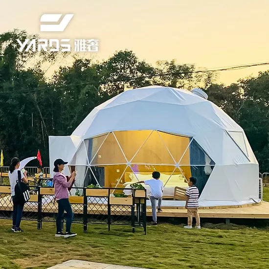 Features Working Temperature Range: -30 to +40ºC Our dome tent has two-layer of cover fabric and insulation liner. It is suitable for living in various weather conditions from 40ºC to minus 10ºC. It will be perfectly fitted in colder or hotter weather with the optional floor heating, air conditioning, fireplace, or other configurations. Wind Load: 80-120km/h The wind resistance of the tent depends on the connection method of the base. Our glamping dome tent has a solid foundation and can withstand level 12 typhoons, with a snow load of 0.30kN/m. Snow Load: 75kg/m2 The total static weight that can be supported over the entire dome is usually greater than any normal snow load it will have to support, as snow does not easily accumulate on a round roof. If the snow on the dome reaches 15cm, you should remove it with a broom or similar tool in order to prevent damage to the dome cover. Life Span: Frames 15+ years, covering fabric 8-10 years The lifespan of a tent mainly depends on the performance of the cover tarpaulin, which is generally 8-10 years of life. Our cover fabric is tear-resistant, durable, waterproof, fire retardant, mold-proof, and anti-corrosion. 100% waterproof; flame retardant to DIN4102 B1, M2, CFM; UV resistant, tear-resistant, self-cleaning ability, etc. All the materials of our domes have passed the environmental testing of China.