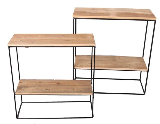 Industrial-style piece with a black metal structure and a matte finish. The two steps of the support are made of recycled wood, thus giving the material a second life.