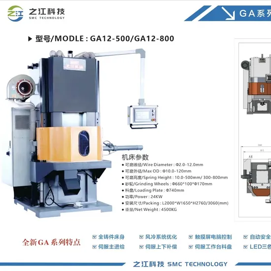 SMC Series of CNC spring end grinding machine is mainly used in synchronized spring of double surface of compression spring,including cylindric spring,conical spring and double conical spring. The machine adopts two vertical grinding wheels to grind springs put on feeding plate which pass through two grinding wheels. Feeding speed of upper grinding wheel can be adjusted. Through manual feeding mode or automatic feeding mode spring can get the preset height,you can obtain the greatest capacity of grinding according to the pressure. The machine has automatic compensation,automatic reset,giving alarm function,through man-machine dialogue manner and programmed on the computer screen,convenient operation and high production efficiency,it is ideal equipment for mass springs double surface grinding.