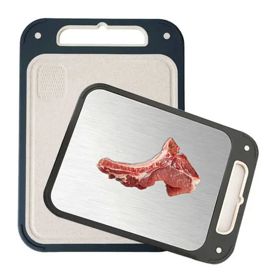 Unleash the full potential of culinary artistry with our exquisite Double-Sided Stainless Steel Wheat Straw Cutting Board. This moisture-proof marvel is expertly designed for the precise chopping of vegetables and meats, and comes with a built-in Garlic Ginger Grinder to elevate your kitchen's functionality to new heights. Key attributes Industry-specific attributes Shape Rectangle Material Meticulously crafted from superior 304 stainless steel combined with Wheat Straw PP, this cutting board promises unparalleled durability while promoting an eco-friendly kitchen atmosphere. Feature Embrace an environmentally responsible lifestyle with each use, making it the quintessential choice for eco-aware kitchens. Other attributes Type Versatile Chopping Blocks tailored for all your gourmet and culinary adventures. Packaging Each cutting board is thoughtfully packaged as a Single Piece, ensuring the utmost quality and ease of use. Place of origin Proudly manufactured in Zhejiang, China, where time-honored traditions seamlessly blend with innovative design. Brand name OEM Model number EG-CB-209 Product name 304 Stainless Steel And Wheat Straw Cutting Board Material A luxurious combination of top-tier 304 stainless steel and Wheat Straw PP, merging aesthetic elegance with eco-conscious innovation. Usage Ingeniously designed for seamless cutting efficiency, turning meal preparation into a swift and enjoyable activity. Shape Rectangle Color Available in sophisticated Black and soothing Light Blue, these colors are curated to enhance and complement any kitchen aesthetic. Feature Environmentally sustainable and equipped with antibacterial properties, ensuring a safe, hygienic, and eco-friendly chopping experience. Packaging Single Piece Package, ensuring utmost safety and convenience during delivery. Logo Accepts Customized Logo for a touch of personalized branding and distinct identity. MOQ Minimum order of 50 pieces, perfectly catering to the needs of both burgeoning businesses and established enterprises. Size Generous dimensions of 35*25cm, perfectly accommodating a wide range of kitchen tasks. Packaging and delivery Selling Units: Available as a Single item, ideal for both individual consumers and bulk buyers. Single package size: Expertly packaged to guarantee safe delivery, with precise dimensions: XX cm. Single gross weight: Strategically calculated to maximize shipping efficiency, weight: kg.