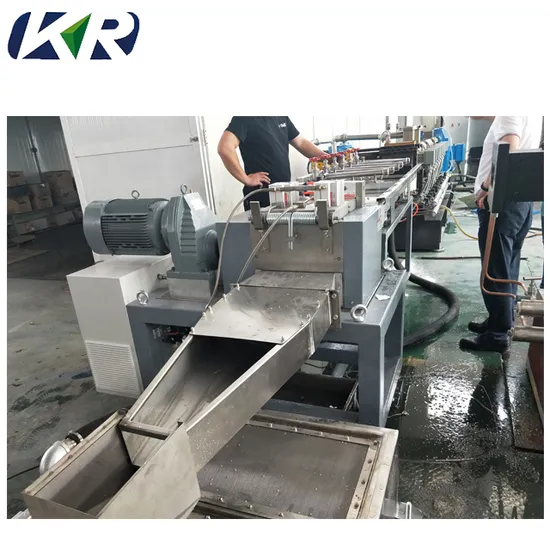 The plastic recycling twin screw extruder line with belt conveyor, crusher, extruder, auxiliary equipment. The line with characteristics of high output, low energy dissipation, labor-force saving, and high quality pellets, is an ideal equipment for plastic recycling twin screw extruder.