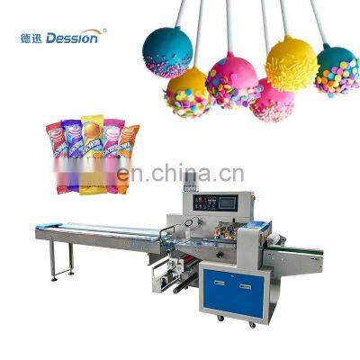 Horizontal pillow and lollipop bag packing machine auto candy packing machine pillowMachine IntroductionPackaging ApplicationAutomatic flow packing machine is a widely used packing machine. Suitable for all kinds of product packaging. Including medicalsupplies, vegetables and meat, baked bread, snacks and candy, daily necessities, hardware accessories, etc.Packing EffectThe effect after packaging is back-seal bag. According to demand, other devices can be customized or upgraded to meet other models. For example, pillow bag with hole, bag with label, gusset bag, etc.Machine Structure and ParametersMachine Characteristics1. Double frequency conversion control, the bag length canbe set and cut, no need to adjust the air, one step in place, saving time and film.2. Man-machine interface, parameter setting is convenient and quick.3. Fault self-recognize function, fault display at a glance.4. High-sensitivity photoelectric eye color tracking, digital input sealing position, make sealing position more accurate.5. Temperature independent PID control, better suitable for various packaging materials.6. Positioning stop function, no sticky kuife, no waste film.7. The transmission system is simple, the work is more reliable, and maintenance is more convenient.8. All control is implemented by software, which is convenient for function adjustment and technical upgrade, and never lags behind.ModelDS-250XDS-350XDS-450XDS-600XDS-700XDS-800XFilm Width(mm)Max.250Max.350Max.450Max.600Max.700Max.800Bag Length(mm)45~33065~330120~450130~450120~600120~600Bag width(mm)30~11050~16060~21060~28050~33050~380Products Height(mm)Max.70Max.80Max.110Max.150Max.150Packing Speed(bag/min)40~23030~15030~15020~12030~150Machine Power220V / 380V, 50/60HZ,2.4KWMachine Size(L*W*H, mm)3920*670*13204020*720*14503900*900*14683990*1000*14684400*1100*14604400*1200*1460Machine Weight800KG900KG900KG1050KG1050KG1050KGDetails ImagesMachine WorkflowThis machine is easy to operate. Just set the parameters on the screen, and then you can start the machine. Put the product on the conveyor belt, the machine will automatically pull the film, the bag is formed, sealed, and finally the bag is cut.Multilingual touch screenThe machine supports various language customization, easy to operate.High sensitivity eye sensorThe eye sensor automatically senses the color code to ensure accurate and beautiful packaging effects.Replaceable bag formerWhen you want to change the bag width, you only need to change a different size bag fromer.Electronic control componentUse Panasonic PLC and frequency converter to ensure the stable operation of the machine.Related ProductsWhy Choose UsVR1. Professional and Strong TeamDession has a professional team that can provide customers with various packaging solutions. After fully understanding the customer's needs, we provide the most suitable packaging solution to the customer. Then start the production of the machine. We have a strong production and processing capacity, from the customized processing of accessories to the assembly and debugging ofthe machine. Finally, it is packaged and shipped, and it only takes a week to complete.2. Excellent transportation serviceAccording to the needs of customers, we can provide sea transportation, air transportation, and land transportation services, so that you can get the machine as soon as possible. Provide door-to-door transportation services.3. Timely and effective after-sales serviceChoosing us is not only buying a machine, but also our professional and timely service. 1. When the machine is delivered, we will attach a video of the installation and operation of the machine, so that you can use the machine quickly. 2. All electrical appliances of our machines have a one-year warranty, and we will replace them if they fail. 3. When your machine fails, we will have professional engineers to provide professional online after-sales service to help you solve the problem. 4. If the problem cannot be solved online, we will arrange an engineer to repair it on site within a week.Buyer FeedbackWe have 8 years of experience in foreign trade and export, and now our customers have spread to 90 countries all over the world. With our high-quality machines and professional services, we have won unanimous praise from our customers.Company Profile Dession a leading manufacturer of Packaging machine and supporting facilities, which has successfully developed more than 80 kinds of packaging machines. Dession Packaging Machine has widely applied for different fields throughout the world, such as food/ industrial food, medicines, hotel supplies, disposable goods, rubber goods, daily appliances, hardware fittings, sporting goods, toys etc. Dession has more than 8000 square meters of production plants, 5 production workshops and a parts processing workshop, including small vertical machine production workshops, vertical machine production workshops, pillow machine production workshops, cartoning machine production workshop and filling machine production workshop.FAQQ1:Do you have manual or operation video for us to know more about the machine? Yes, not only manual or operation video, 3D drawing also available to make as per your design,also the video we can make of testing the material from our packaging machine if your packing goods easier for us to find from our local market. Q2:How can I trust you for the first time business ?Please note our above business license and certificate. And if you don't trust us, then we can use Alibaba trade assurance service, guarantee your money, and guarantee your machine's on-time delivery and machine quality.Q3:Is engineer available to serve oversea?Yes, but the travel fee is paid by you. So actually to save your cost, we will send you a video of full details machine installation and assist you till the end.Q4:How can we make sure about the machine quality after we put the order?Before delivery, we will send you the pictures and videos for you to check the quality,