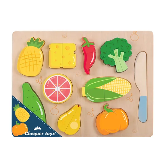 Early educational toy pretend kitchen food toy wooden cutting fruit and vegetables. Imitative fruit and vegetables would appeal the children's attention. Cultivate manual brain skills, grasping, vision, interest training, intellectual development, sensory, emotional, auditory, other ability development, parent-child communication, hand-eye coordination, interactive toys