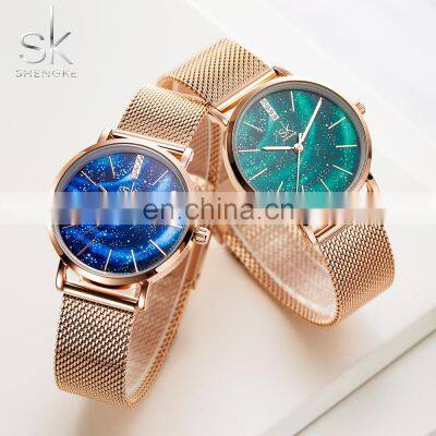 SHENGKE Elegant Lady Wristwatch Starry Sky Dial Stainless Steel Milanese Mesh Band Quartz Movement K0103L FAQ 1.What is your MOQ (MOQ=Minimum Order Quantity)?If you order our brands (SINOBI / SK) watches which we have in stock, no MOQ limited, you can buy how many you want, and can mix with different models and different colors.For OEM or ODM order with brand your logo, the MOQ depends on the case material: ally case watches MOQ is 300pcs , stainless steel case watches MOQ is 500pcs 2.Can you provide sample first before I place mass production order?Yes, we can provide samples for your reference, and the sample fee will be returned to you when you order mess bulk products which reaches minimum order quantity 300~500 pieces3.How about your products quality?Our quality had praised so many clients , quality advantage as below :1)All our SINOBI and Shengke (SK) watches are at least 3ATM water resistant, 100% tested by Waterproof Testing Machine.2)All our brands’ watches are vacuum plated,color would last at least 1~2 years.3)For OEM or ODM watches, we will produce the watches as your requirements. It can comply with CE&RoHS, etc. You can arrange your QC team or hire the third party to test the watches before delivery.4.How long is your warranty time?All our Sinobi and Shengke (SK ) brands watches’ is 12 months warranty. 5.What's the delivery time?If take our brand logo watches, the delivery 3~7 days after paymentFor OEM orders, the delivery time is : alloy case watches 20~25 days , stainless steel case watches 45~50 days 6.How about shipping methods?If you have a courier in China, goods can be sent to your courier after payment.If you have no cooperated courier, we will check the shipping details and cost for you after your final order is confirmed.7.Are you factory or trade company?We are factory (in Guangzhou ,China),welcome to visit our factory, if you are interested in our factory ,please contact us for more details.8.How to place an order?Click below picture to contact with us for more information