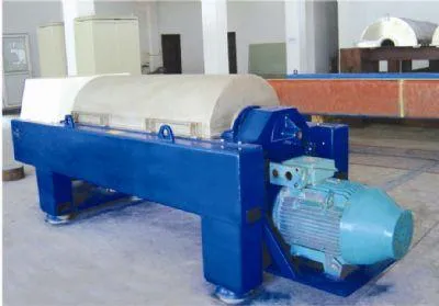 under the action of the centrifugal force field, the relatively heavier solid-phase material deposits on the drum wall forming the residue layer; the solid-phase residue is continuously pushed by the spiral feeder to the conic end of the drum and, after dehydration in the drying area, is discharged out of the machine.