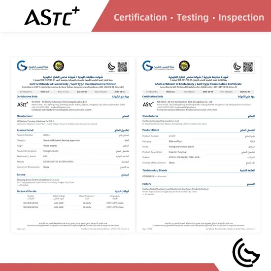For certification: ASTC+ is authorized by the Middle East GSO organization, Saudi Arabia SASO, and Egypt GOEIC organization. It is capable of issuing CoC and GCC certificates (for toys and home appliances), Saudi Arabia SABER PCoC and SCoC, Egypt ILAC COI, and Africa COC certificates for export companies, among others.